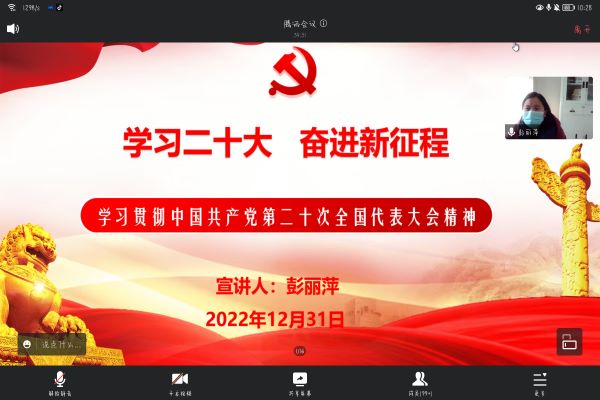 为学习贯彻党的二十大精神,12月31日,校辅导员理论宣讲团成员、生命与健康科学学院党委副书记彭丽萍通过腾讯会议,为学院各班班长、团支书,以及学生会全体成员开展以“学习二十大奋进新征程”为主题的党的二十大精神理论宣讲。