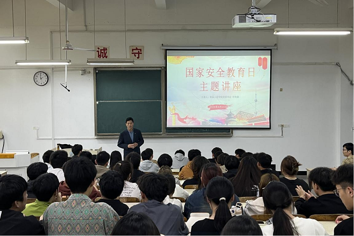 为牢固树立总体国家安全观,提高广大师生的国家安全意识,4月15日下午,食品工程学院在求知A105室举办国家安全教育日主题讲座。学院党委书记付光玺出席并主讲,讲座由学院党政办主任赵传磊主持,全体辅导员、各年级学生代表参加讲座。