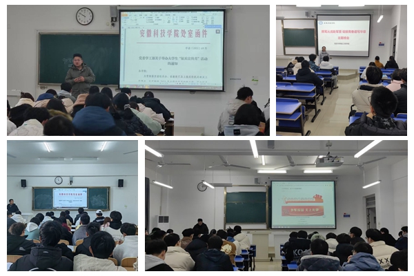 12月3日-18日,各班毕业班辅导员组织班级同学开展“携笔从戎赴军营 绽放青春谱华章”主题班会。会上,各班辅导员带领同学们认真学习了《2023年征兵工作手册》以及《安徽科技学院应届毕业生应征入伍宣传单》。各班辅导员针对宣传单中的征兵政策、报名流程、体检标准流程对同学们进行详细的解答,积极动员青年学子们响应党和国家号召,并发扬勇于担当、敢于献身、报效祖国的精神,在绿色军营中书写无悔青春。会后,有些同学有应征入伍的想法,并针对自身关心的入伍要求和征兵政策进行咨询,解除了他们的后顾之忧。