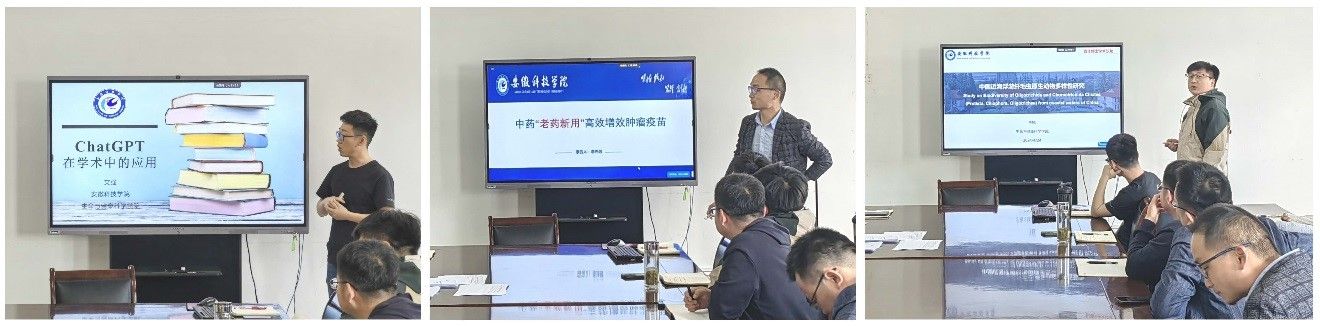 艾强、李先强、王锐三位博士结合研究方向分别进行了学术交流研讨报告。其中,艾强以《人工智能在学术中的应用》为题,着重介绍了ChatGPT的发展历程、应用范围以及具体使用方法,为教师开展学术研究提供了极大帮助;李先强以《中药“老药新用”高效增效肿瘤疫苗》为题,介绍了新型制剂技术提升中药在重大疾病上的应用,着重阐明外泌体作为免疫佐剂提高肿瘤疫苗的临床药效,为肿瘤药物研发提供了新思路;王锐以《中国近海浮游纤毛虫原生动物多样性研究》为题,介绍了纤毛虫的分布及种类,详细分享了其发现纤毛虫新属的科研经历,为生物多样性的探索与物种分类研究开辟了新视野。