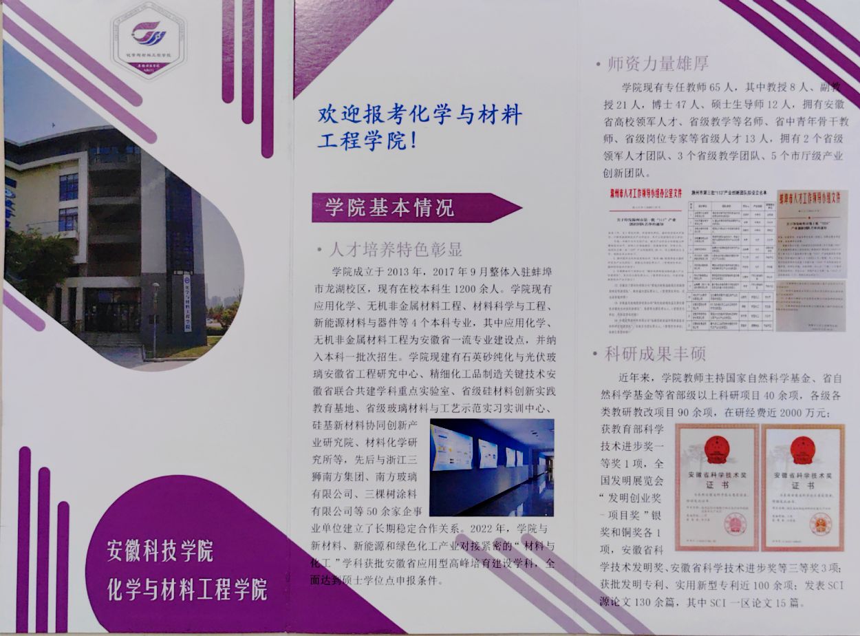 为积极应对新旧高考志愿填报模式转变可能带来的生源质量变化挑战,化学与材料工程学院在高质量完成学校下达的招生宣传任务基础上,学院还制作了“欢迎报考安徽科技学院化学与材料工程学院”H5易企秀,组织师生利用微信群、QQ群宣传;学院印制了“欢迎报考化学与材料工程学院”纸质宣传册子,随同学校的宣传材料一并发放,主动向有化学及材料类报考意愿的考生及家长介绍学院,吸引考生关注学院。