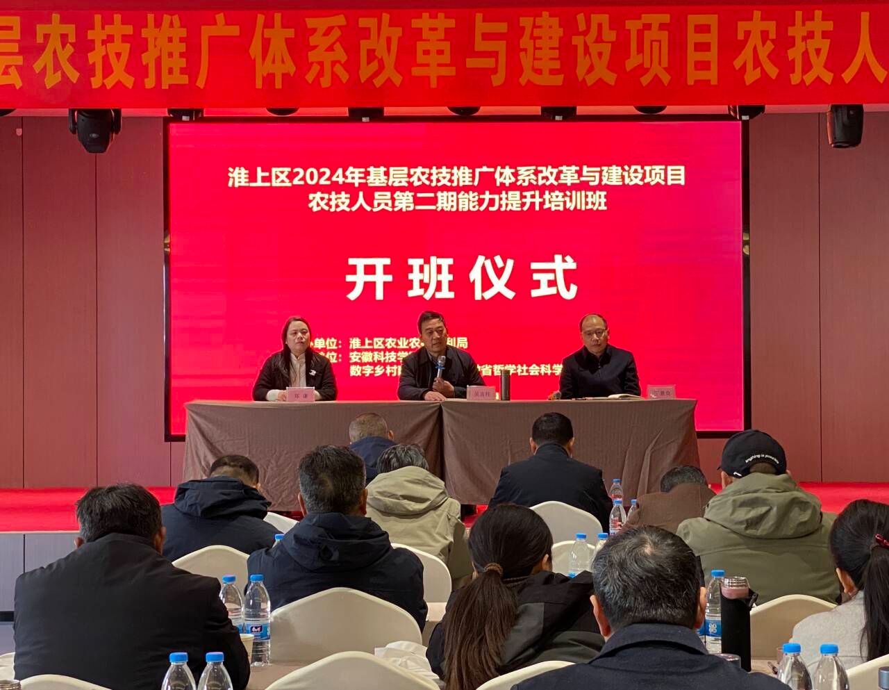 为全面推进乡村振兴,深化淮上区基层农技推广体系改革,11月26日,淮上区基层农技人员第二期能力提升培训班在蚌埠市淮上区举办开班仪式。此次培训由淮上区农业农村水利局主办,我校管理学院、数字乡村建设与安徽省哲学社会科学重点实验室联合承办,淮上区农业综合服务站站长吴言柱,管理学院党委书记丁景良,副院长郑谦出席开班仪式,仪式由丁景良主持。