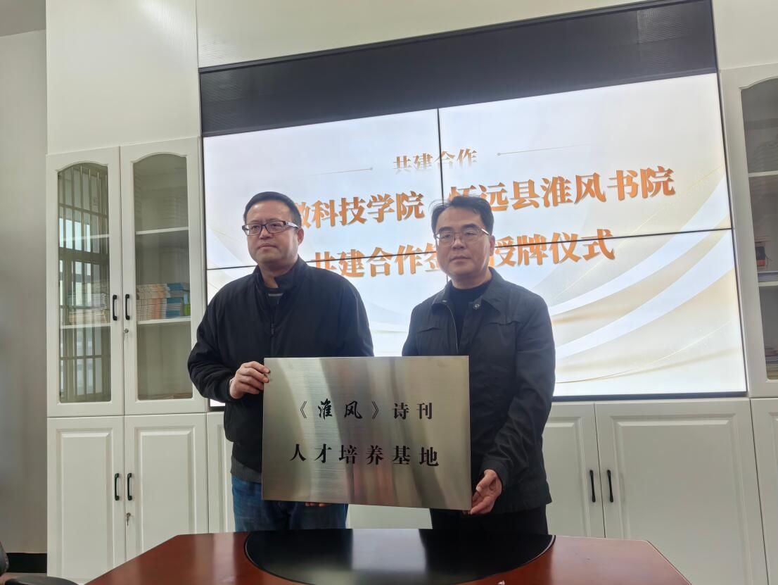 在签约暨授牌仪式上,李晓东、宫蔚国分别代表双方签署了共建实习实训基地协议,并举行“安徽科技学院共建合作基地”“《淮风》诗刊人才培养基地”“ 《淮风》诗刊文学创作基地”授牌仪式。