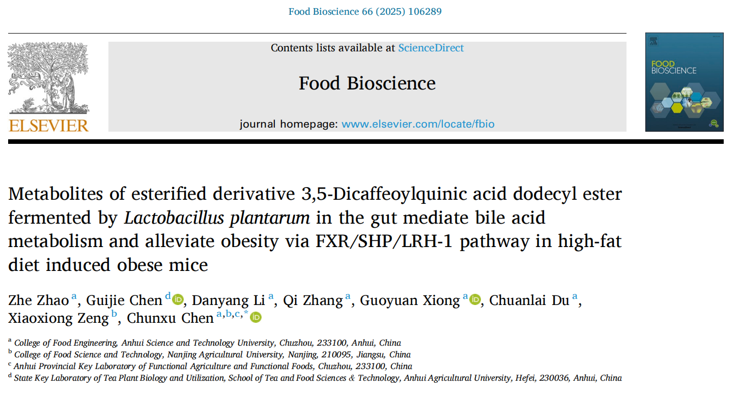 近日,食品科学与工程学院陈春旭副教授以通讯作者身份在国际Top期刊《Food Bioscience》(Q1,影响因子4.8)在线发表题为“Metabolites of esterified derivative 3,5-Dicaffeoylquinic acid dodecyl ester fermented byLactobacillus plantarumin the gut mediate bile acid metabolism and alleviate obesity via FXR/SHP/LRH-1 pathway in high-fat diet induced obese mice”的研究性论文。安徽科技学院2022级食品加工与安全专业硕士研究生赵哲为论文的第一作者,安徽科技学院为论文第一完成单位,南京农业大学曾晓雄教授课题组为合作单位。