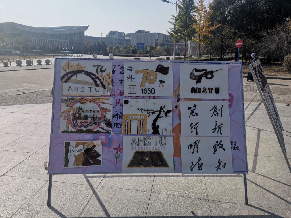 11月7日,种子画在西区小广场被展出,十几幅作品展现了农学院学子对学校的热爱和祝福。这些作品清新自然、细腻生动,描绘了安科的标志性建筑、70周年校庆标识以及凤阳多姿多彩的地方特色风物。展览开始后,同学们纷纷前来观看,拍照留念,不少同学对展出的作品发出赞叹:“原来,平时常见的种子也能描绘出这么好看生动的图片!”“这个彩虹桥拼得好逼真,一看就知道是安科。”“这几幅图拼的是我们的新校训——明德,致知,笃行,创新。”