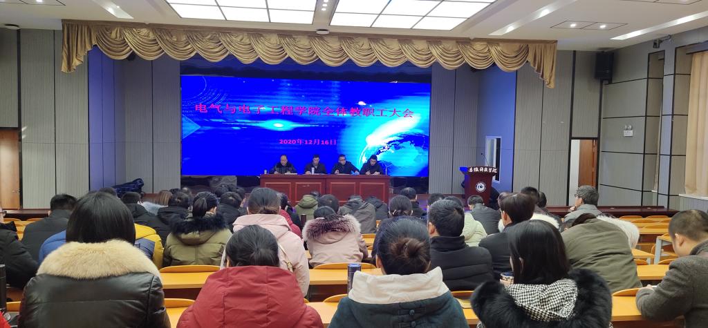 12月16日下午,电气与电子工程学院在敏A报告厅召开全体教职工大会,学院党委书记骆海邦,党委副书记、副院长夏显明,党委副书记尚磊,院长助理国海及全体教职工参加会议,会议由骆海邦主持。