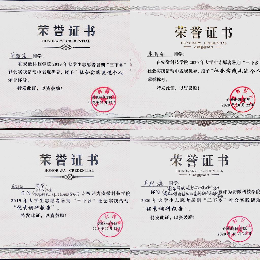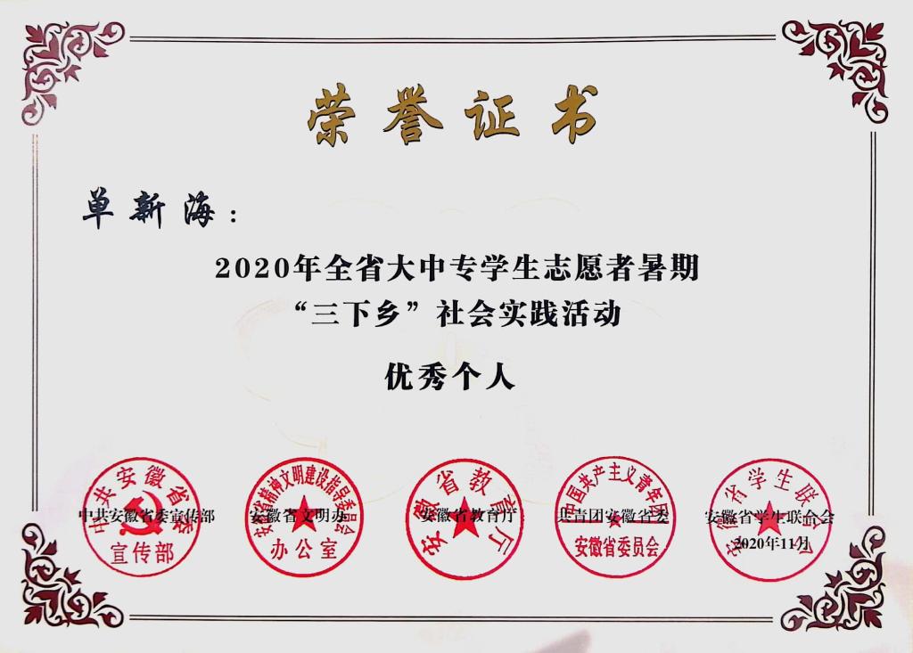 单新海注重大学生道德榜样的树立,用身边事教育身边人,充分发挥榜样的力量,自新冠肺炎疫情暴发以来,积极响应学校号召,挺身而出,在全国疫情防控大形势下,单新海根据自身所在地区的特点进行2020年大学生创新创业项目的申报-《新冠疫情对合肥市农村地区基层治理的挑战与应对研究》,获国家级大创项目立项。其内容是通过调查合肥市地区乡村基层治理现状,归纳、实证分析新冠疫情对合肥市农村地区治理的挑战。探讨国外典型国家农村治理问题的一系列经验和教训,总结先进典型,获取典型做法,并提出新冠疫情对合肥市农村地区基层治理挑战的应对策略。