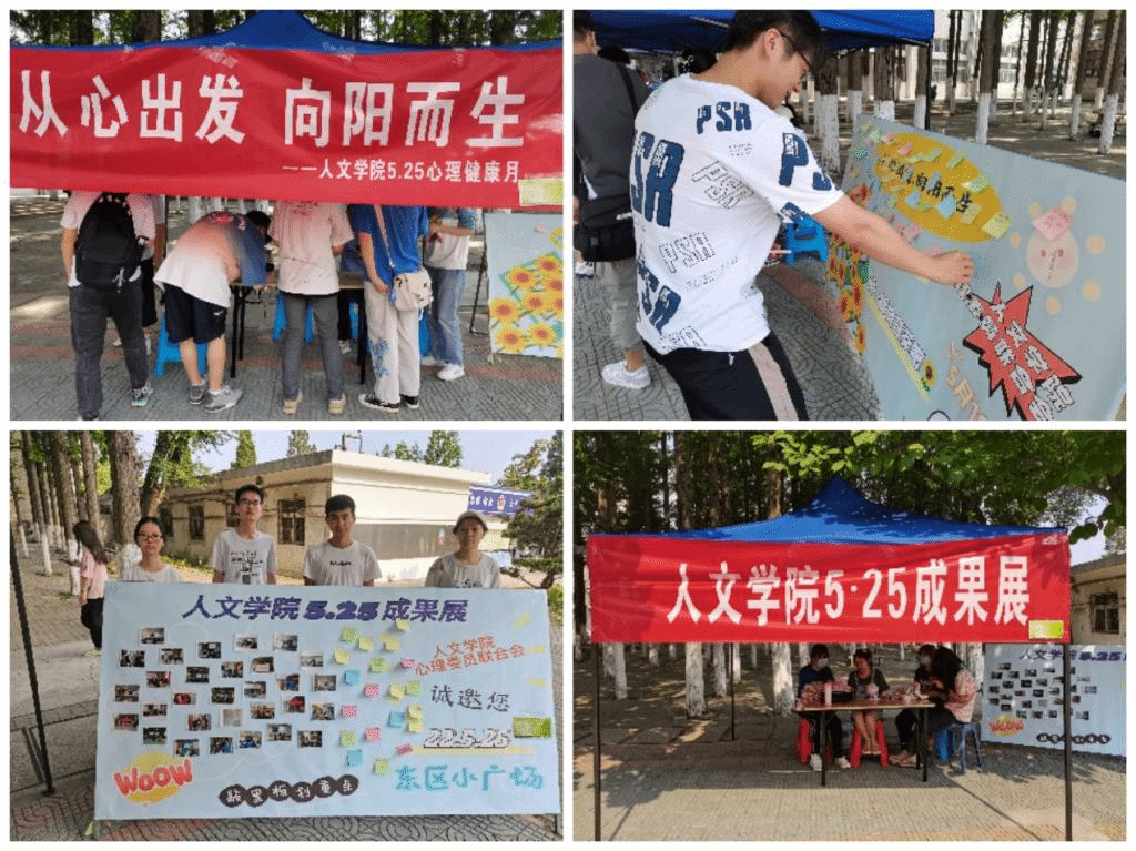 5月25日,人文学院“5 25心理健康月成果展”在东区小广场举行,展板上丰富多彩的照片展示了人文学院心理健康月系列活动的成果,见证了人文学院心联成员的付出与努力。本次活动的圆满举办,创新了心理健康教育形式,普及了心理健康知识,在全校营造了关注心理健康、懂得心理健康、重视心理健康的浓厚氛围。(特约通讯员:鲁冰冰 审核:李沙娜 编辑:张威)