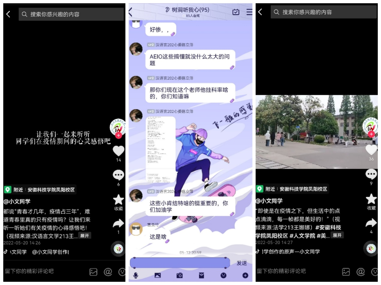 5月17日至5月19日,人文学院举办了“疫情心分享”短视频展示活动。同学们用精彩的短视频作品讲述了自己在疫情防控期间的所见所闻、所思所感。其中既有对抗疫工作者的致敬,也有疫情防控期间同室友一起解压的欢乐瞬间;既有对校园景物的细膩观察与描绘,也有对日常生活所思所想的记录;还有用心总结的疫情防控小贴士,展现了人文学子昂扬向上、积极乐观的青春姿态。风卷“疫”云去,花开满庭芳。同学们通过短视频留住了关于这个春天的特殊记忆。