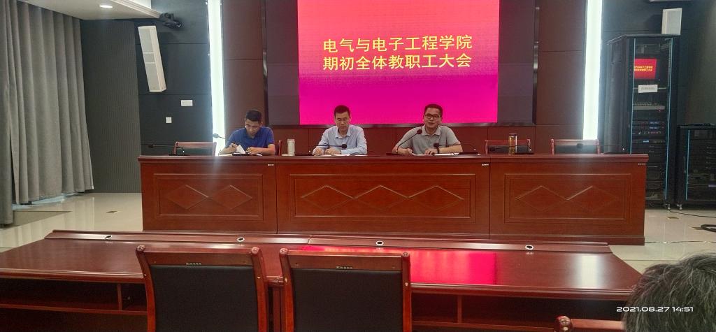 8月27日下午,电气与电子工程学院在综合信息中心西辅楼111报告厅召开期初全体教职工大会。学院党政领导和全体教职工参加了会议,会议由党委副书记、副院长(主持工作)夏显明主持。