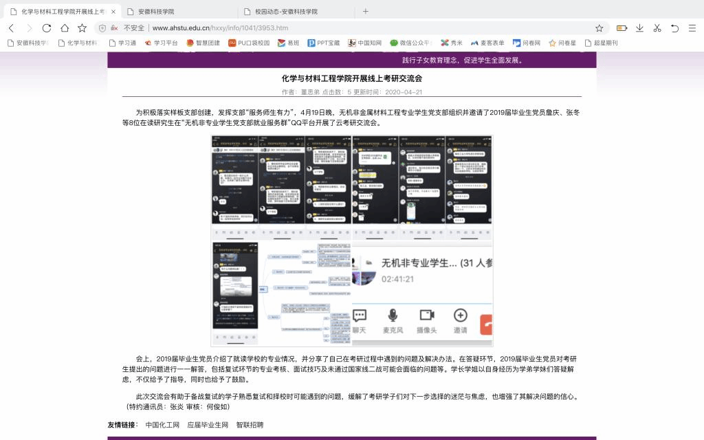 2月份,支部在学院党总支的部署和安排下积极组织和发动募捐,最终在学院师生的共同努力下,一天多时间筹集到资金2.1万元。支部党员表示要与祖国共命运、同呼吸,同舟共济,共克难关。支部为了解决考研复试学生面临的困难,在前期收集了同学们的问题,于4月19日,组织并邀请了2019届毕业生党员詹庆、张冬等8位在读研究生在“无机非专业学生党支部就业服务群”QQ平台开展了云考研交流会,毕业生党员针对收集的问题分享了自己在考研过程中遇到的问题及解决办法,缓解了同学们应对复试的迷茫与焦虑,也增强了同学们直面问题的信心。