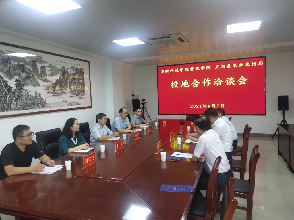 9月7日下午,管理学院党委书记丁景良、院长陈传万、副院长郑谦、副院长张国宝及刘宗飞博士一行5人,应邀赴五河县农业农村局开展校地合作洽谈活动,受到五河县农业农村局局长陈之柏等局领导热情接待。