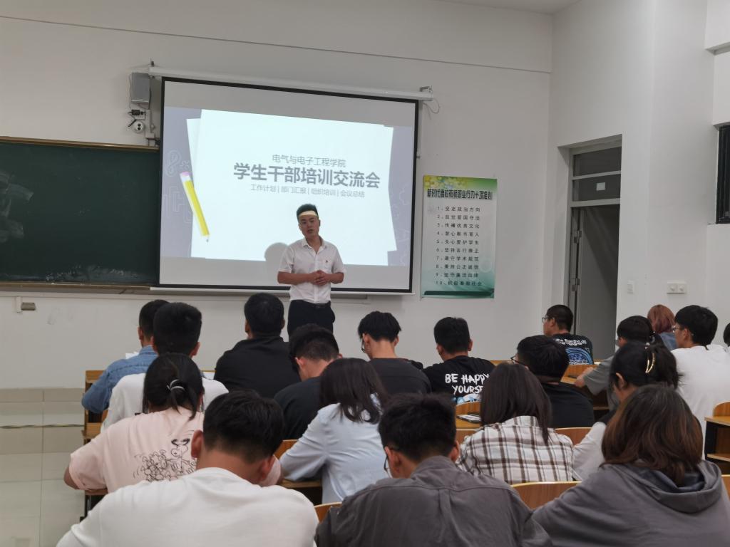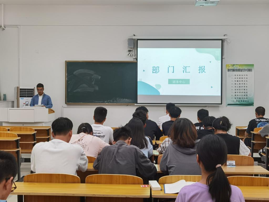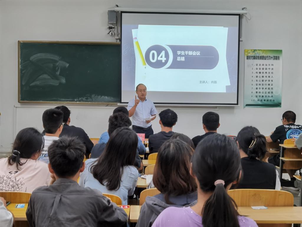 于宏亮对学生会、社联、团委、艺术中心、体育中心及各班团支书等主要学生干部从以下四方面进行培训。一、要认真学习习近平总书记关于青年大学生成长的重要要求相关内容;二、学生组织要牢记为同学服务的宗旨;三、学生组织要和同学们建立良好的沟通,共同合作、共同进步、共同成长;四、要落实学生干部的主体责任,做到自我管理、自我服务、自我监督。最后,各学生组织负责人对上一学年的工作做出总结,学生会负责人对新任各部门负责人做出具体安排。