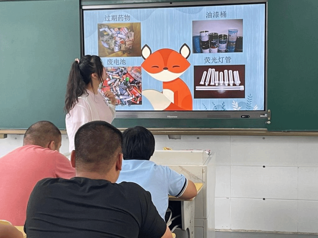 和老师沟通完后,团对成员结合专业知识首先给特殊儿童讲解了垃圾分类的重要性以及意义,然后讲解了日常生活中我们如何正确对垃圾进行分类,并且在最后有一个提问环节,让他们对PPT上的图片来进行垃圾分类,从而加深他们在垃圾分类方面的认识,他们都积极回答,课堂效果良好。
