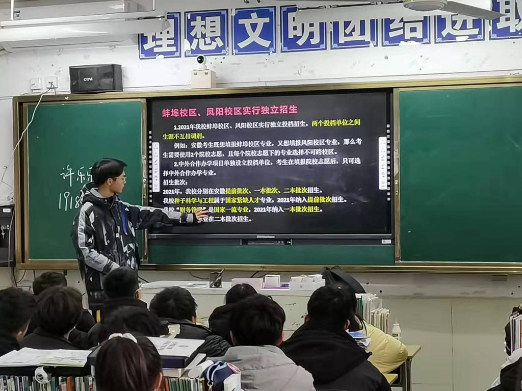 交流会上,团队首先介绍了安徽科技学院源远流长的校史,以及学校的教学环境、教学资源、校园活动和实验室等等。随后播放了学校的宣传视频。团队队员和学生们分享高三的学习经验,并鼓励他们努力学习争取考上满意的大学。同学们对大学生活十分感兴趣,纷纷举手询问关于大学如何选专业,大学里如何选择社团,以及宿舍条件等方面的问题。队员对同学们的问题一一进行了解答,并表示期待未来可以在安徽科技学院见到他们。