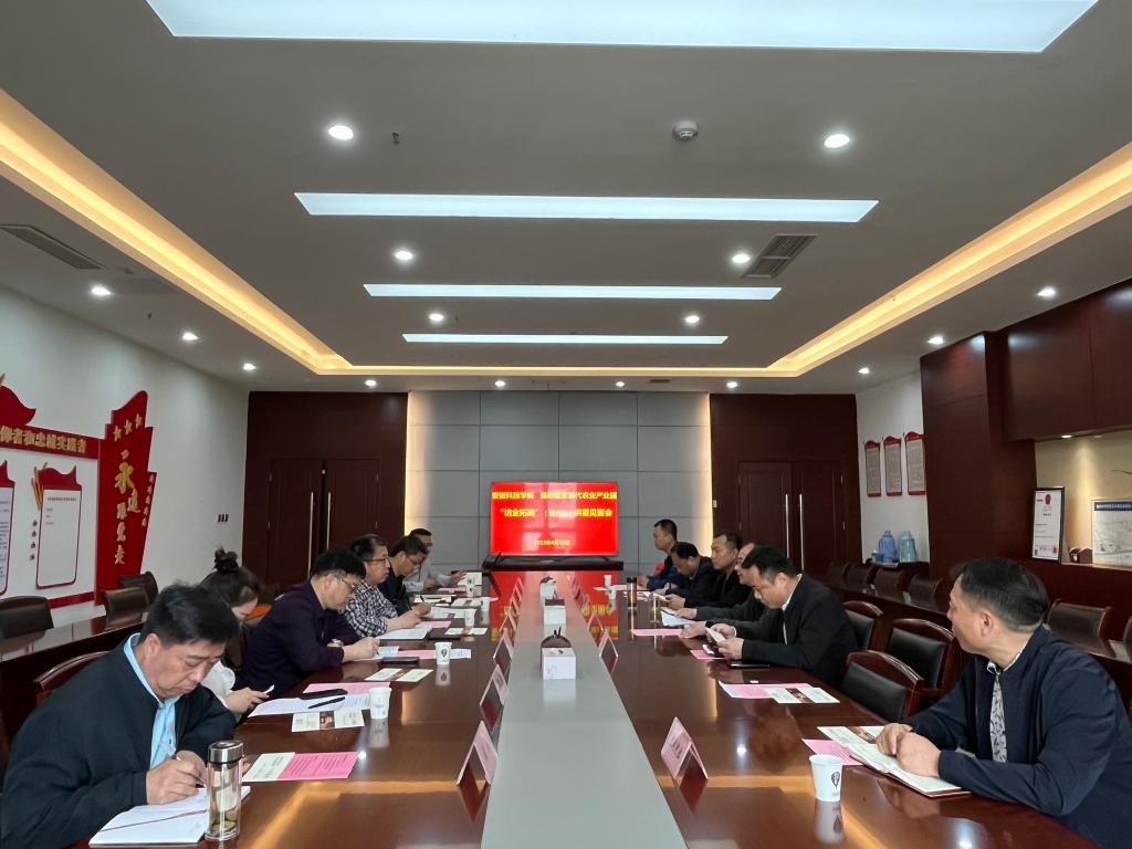 随后在管委会会议室,崔漓江主持召开了安徽科技学院“访企拓岗”(宿州站)供需见面会,宿州市人社局SYB国家级培训讲师张林,宿州市天荣人力资源有限公司总经理郑萌,安徽金海面业股份有限公司董事长张炎,安徽荃银兴大种业有限公司人事财务科科长杨海,埇桥国家现代农业示范区非公企业联合党支部书记、安徽肥地肥业有限公司副总经理张维秀,宿州市高多农牧科技有限公司董事长王凤喜,宿州市埇桥区兴农职业培训学校负责人董存菊等参加了座谈。崔漓江对何世潮等的到来表示热烈欢迎,并转达了正在北京学习的管委会主任、我校优秀校友张梅的问候。崔漓江详细介绍了埇桥区国家现代农业产业园的基本组织框架、取得的成果和未来规划。何世潮对崔漓江等的热情接待表示感谢,并简要介绍了我校办学历史、更名大学进展、毕业生“四能人才”特点,详细说明了此行宿州的目的。舒英杰、张轶辉分别介绍了农学院教学科研、学生工作和农学院党建品牌“一领五农”具体内涵。与会企业代表一一介绍了本企业的基本情况,提出了人才需求。