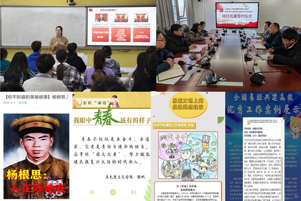 结对共建是我校思政课教师与辅导员合力育人工作的有益工作探索。2021年12月起,学生处、马克思主义学院以一对教师、一个方向、一个学院的方式开展结对试点推广工作,结对老师结合工作实际,自拟主题、线上线下多方位的开展合作,围绕“开办一个特色栏目、打造一项品牌活动、凝练一个研究课题”的工作重点,形成了一批有特色有亮点的合力育人工作成果。一年来,两只队伍合力打造的各类专栏、活动引发广泛关注, “易思堂”思政优课专栏持续推送6期视频课程,“你不知道的英雄故事”专栏营造崇尚英雄学习英雄浓厚氛围,“易话题”因思政名师们的加入吸引学生广泛参与讨论, “五月共话青春”师生共同描述“我眼中青春该有的样子”,引导学生树立远大理想,成为堪当大任的时代新人……2022年入围第六届全国大学生网络文化节和全国高校网络教育优秀作品推选展示的11项作品中,4项由思政课教师和辅导员共同指导;由思政课教师撰写的“1234易起学党史”获评2021年全国易班工作优秀共建案例。(特约通讯员:石志成 摄影:雷莉 审核:黄立义 编辑:张威)