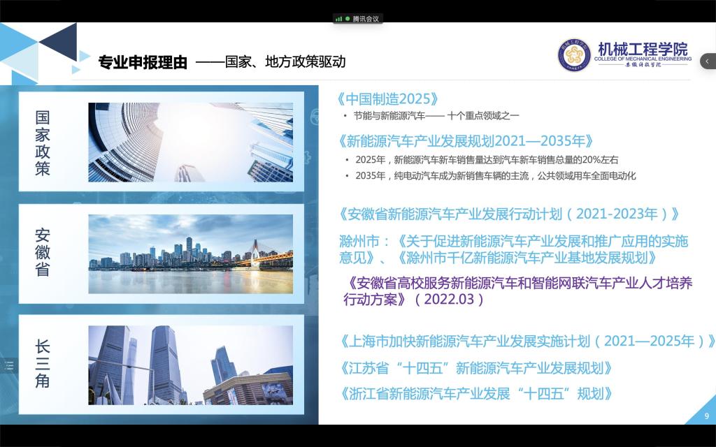 新能源汽车工程专业是依据国家《中国制造2025》等重大战略部署,主动适应汽车产业向着电动化、智能化、网联化、共享化“新四化”的专业布局。2018年,教育部正式将新能源汽车工程专业列入《普通高等学校本科专业目录》,2021年,全国有28所本科院校获批开设该专业。2022年3月,安徽省教育厅、安徽省发展和改革委员会联合下发《安徽省高校服务新能源汽车和智能网联汽车产业人才培养行动方案》,依据文件精神,学校结合办学定位和自身办学优势主动部署新设与新能源汽车和智能网联汽车产业高度契合的新能源汽车工程专业,这是学校发挥传统学科专业资源优势实现传统学科专业新发展,加强“四新”专业布局,优化专业结构,深化学校学科专业结构改革,服务地方产业创新发展的重要举措。汽车工程系对新专业申报工作十分重视,多次组织全系教师进行集体讨论,群策群力,精心策划,严格按照专业申报要求准备相关材料。机械工程学院对新专业申报工作也给予了高度重视,学院于7月13日组织专家组对新专业申报工作进行了论证讨论。7月15日下午,学校召开新专业申报论证工作线上会议,张卫代表学院就新专业申报情况进行了汇报,与会专家对汽车工程系新专业申报准备工作给予了充分肯定并提了出宝贵建议。