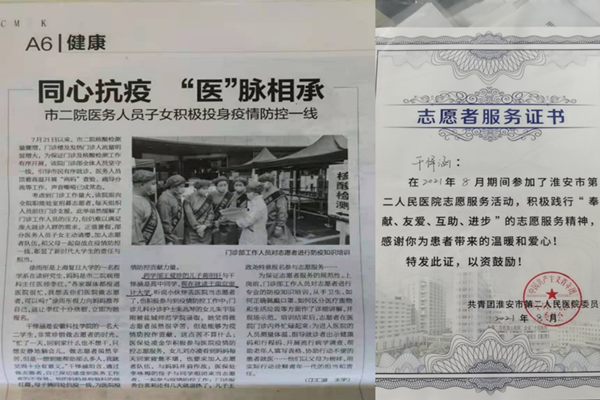 因在抗疫一线志愿服务期间的优异表现,淮安电视台和淮海晚报对干怿涵等志愿者进行了采访。干怿涵说道:“每天回家后动也不想动,只想安静地躺会儿,但是想到能为社会做点事情,能够帮助到那么多人,我感觉很有意义”。在他看来,作为安徽科技学院的一名入党积极分子,在国家和社会需要的时候,应该不畏困难,毅然决然的挺身而出。