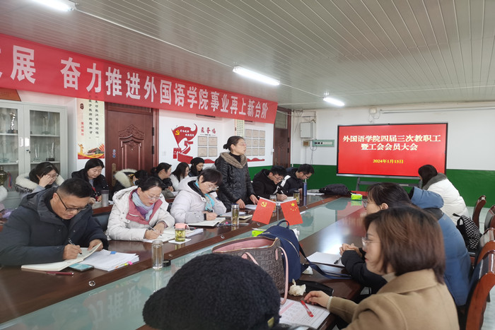 旧岁已展千重锦,新年正待谱新篇。1月15日上午,外国语学院在学院会议室隆重召开四届三次教职工暨工会会员大会,回顾总结2023年工作,部署2024年目标任务。学院全体教职工参加会议,会议由学院党委书记蔡为青主持。