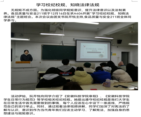 为进一步加强法治宣传教育,贯彻落实学校要求,各班级组织学生登录普法网,认真学习宪法知识,深入学习习近平新时代中国特色社会主义思想,进一步增强法治意识,坚持爱党爱国爱社会主义高度统一。同时,按照要求,各班级组织开展了学校规校纪和学法律知识主题班会,班级主要学生干部在班会上进一步宣讲《安徽科技学院章程》《安徽科技学院学生日常行为规范》《安徽科技学院学生违纪处分办法》《普通高等学校学生管理规定》等校规校纪和法律知识,教育引导同学们掌握法律知识,做一名遵纪守法的好学生。