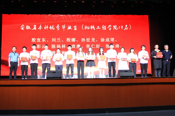 在毕业典礼暨欢送晚会现场,张程宣读了安徽省教育厅、人力资源和社会保障厅、共青团安徽省委联合下发的关于表彰高校2022届优秀毕业生的决定,其中:机械工程学院共有13名学子获评为2022年“安徽省本科优秀毕业生”,陈丰、张严政为13位优秀学子颁发了荣誉证书和纪念品,同时对荣获“安徽科技学院优秀毕业生”的45名机械学子进行了表彰。