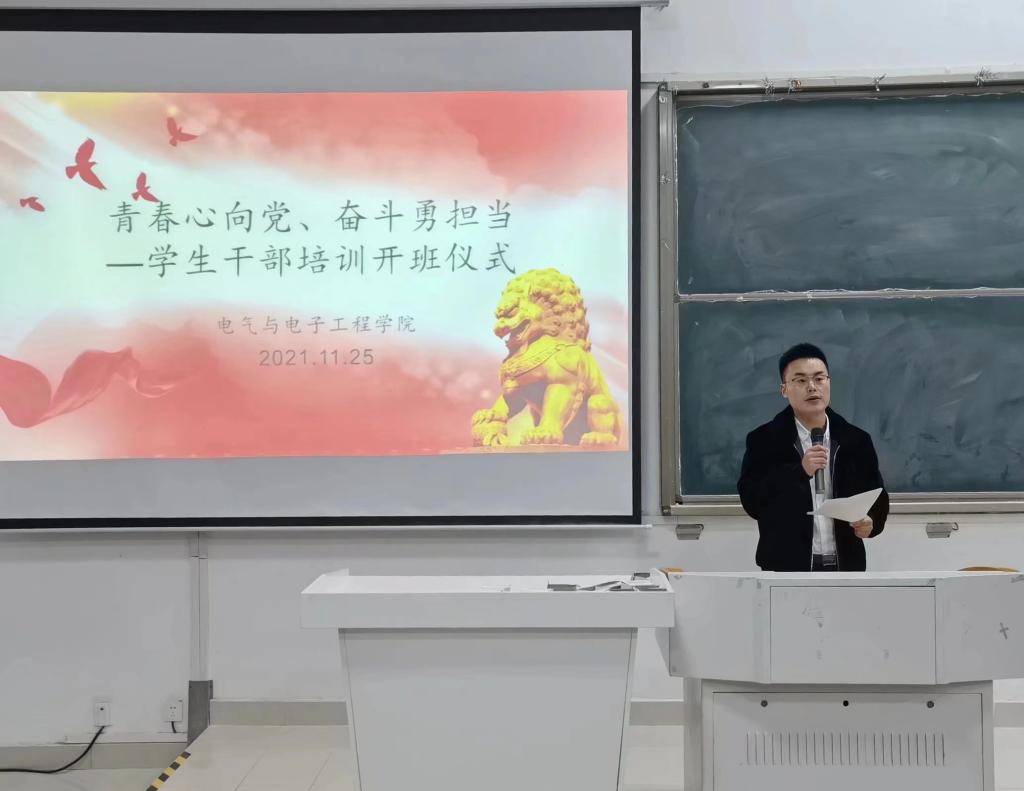 11月25日晚,电气与电子工程学院于致知楼C111举行了2021年“青年马克思主义者培养工程”暨学生干部第二期培训。电气与电子工程学院团委副书记、学生会指导教师于宏亮出席, 2021级全体学生干部和学生组织代表参加培训,会议由于宏亮主持。