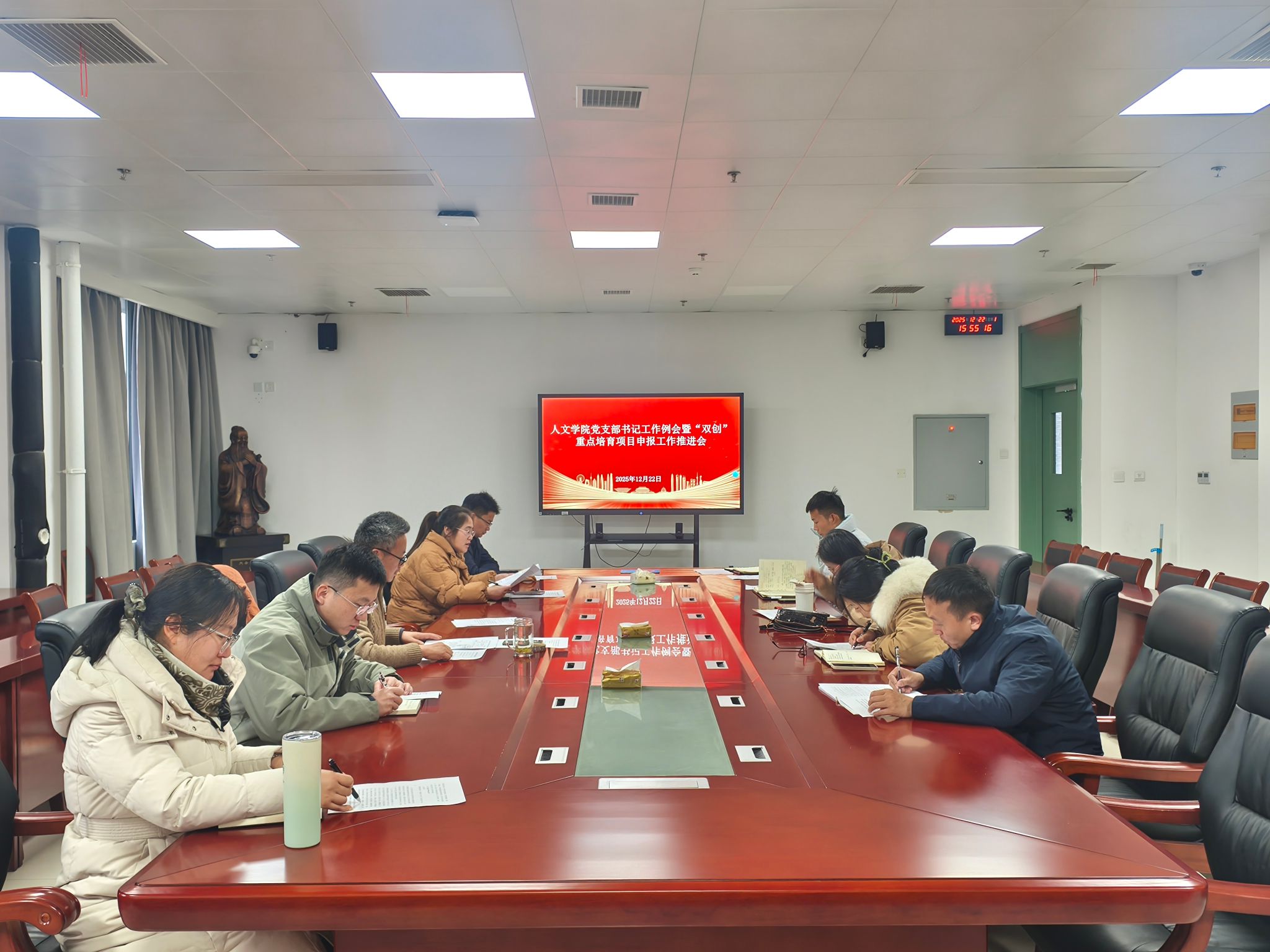 12月22日下午,人文学院党委召开党支部书记工作例会暨“双创”重点培育项目申报工作推进会,学院党政领导、党委委员和全体党支部书记参加,学院党政办公室和团委负责人列席。