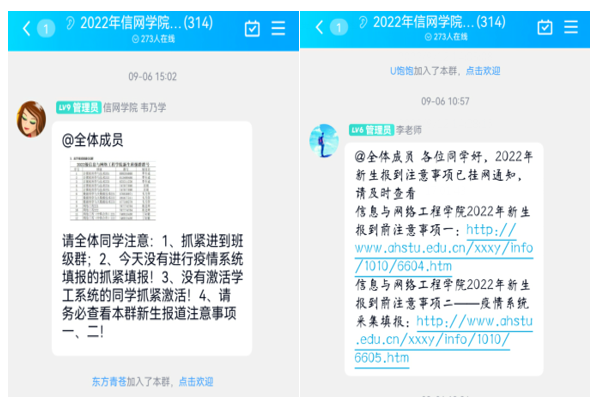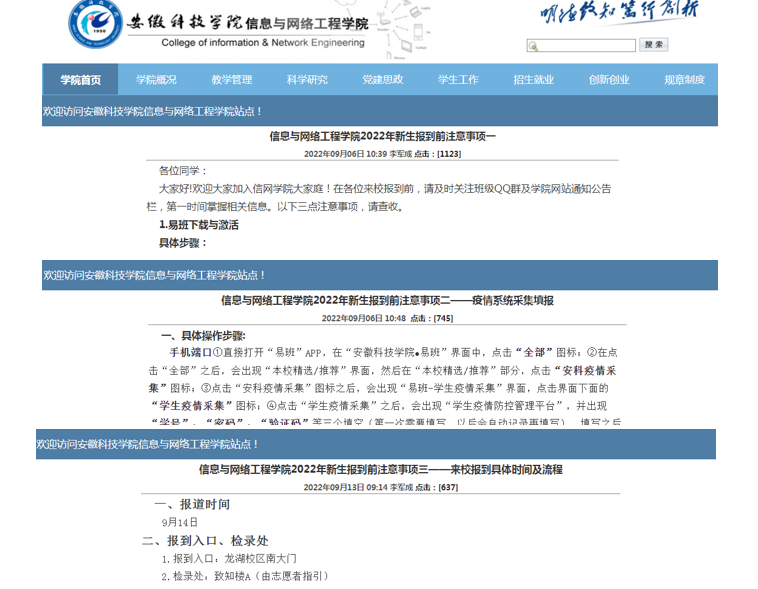 为做好2022级新生报道工作,早谋划、早启动,在新生入校前建立班级QQ群,并在学院官网发布公告,提醒新生关注报到前注意事项,将未校的新生纳入引导教育范畴。2022级的新同学通过学院的官网提前了解了学校学院,通过辅导员和学生党员的教育引导树立了新的目标,做好了来校前的各项准备,为他们即将展开的大学生活打下了坚实的基础。