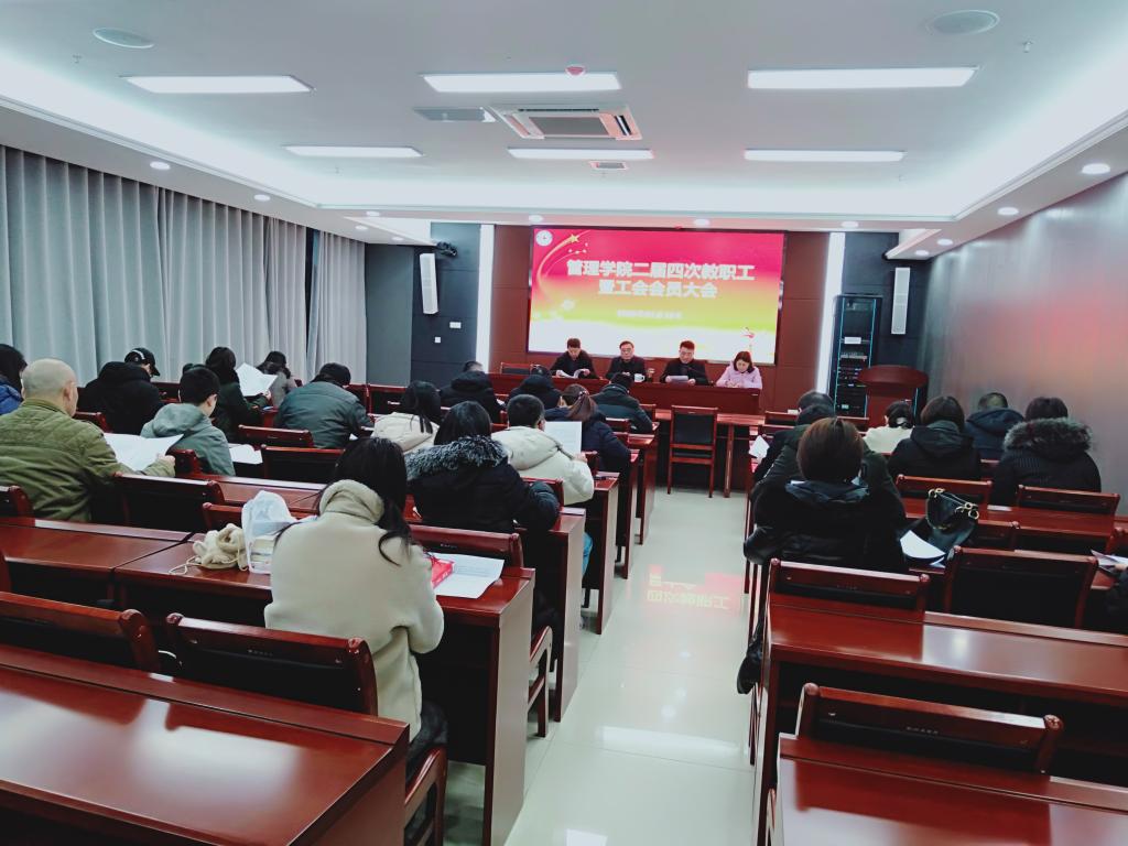 1月10日下午,管理学院二届四次教职工暨工会会员大会在龙湖校区西辅楼一楼会议室召开。院党总支书记姚勇、院长赵伟峰、副院长张德化和分工会主席雷宇在主席台就坐,学院全体教职员工和工会会员参加大会。