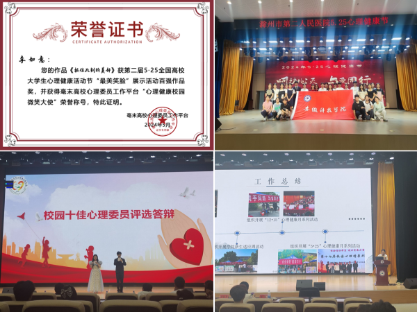活动期间,2023级环境工程专业李如意同学获得“最美笑脸”摄影展全国百佳,学校获得“最美笑脸”摄影展优秀组织奖,学校在参加蚌埠市心理健康知识竞赛、滁州市“5·25”心理健康节等活动中也取得了较好成绩。充分展现了安科学子乐观向上、敢于拼搏的精神风貌。闭幕式上,学校向第十九届“5·25”大学生心理健康月活动组织评比中表现突出的优秀团体、优秀指导老师和校园十佳心理委员颁发了荣誉证书。