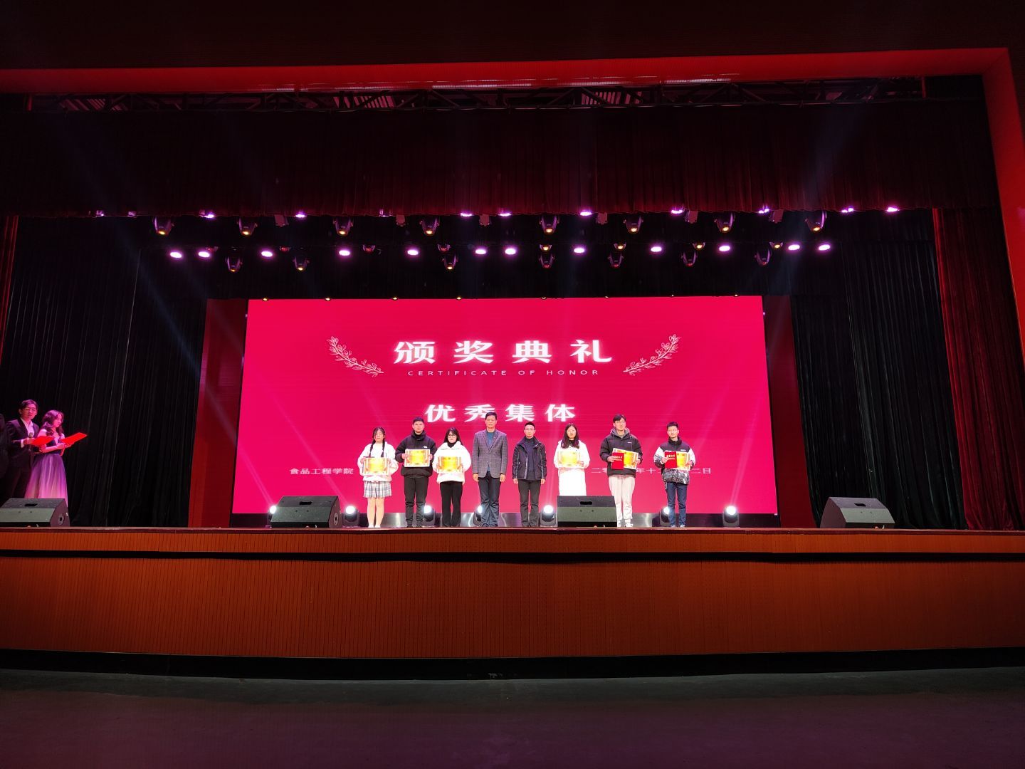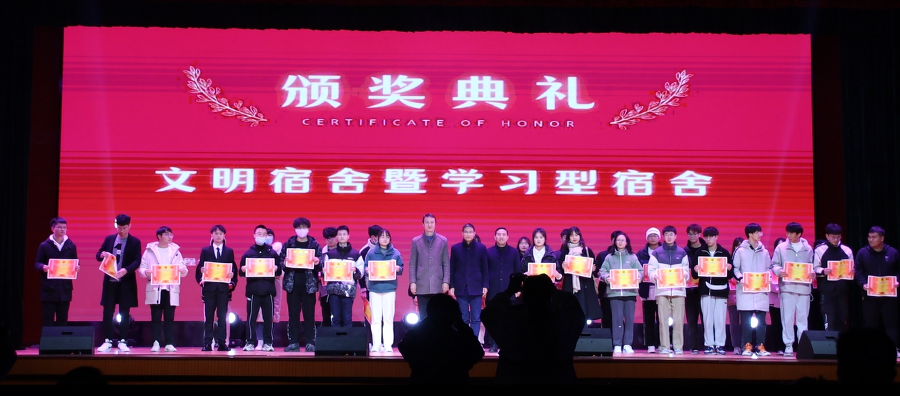 为表彰先进,激励全体学院学子奋发有为、积极进取,晚会还举行了六星学子、十佳大学生、先进班集体、学习型班级、学习型宿舍和文明宿舍等颁奖仪式。卫胜、何永勇、黄立义等领导受邀上台为先进集体和优秀学子颁奖并合影留念。