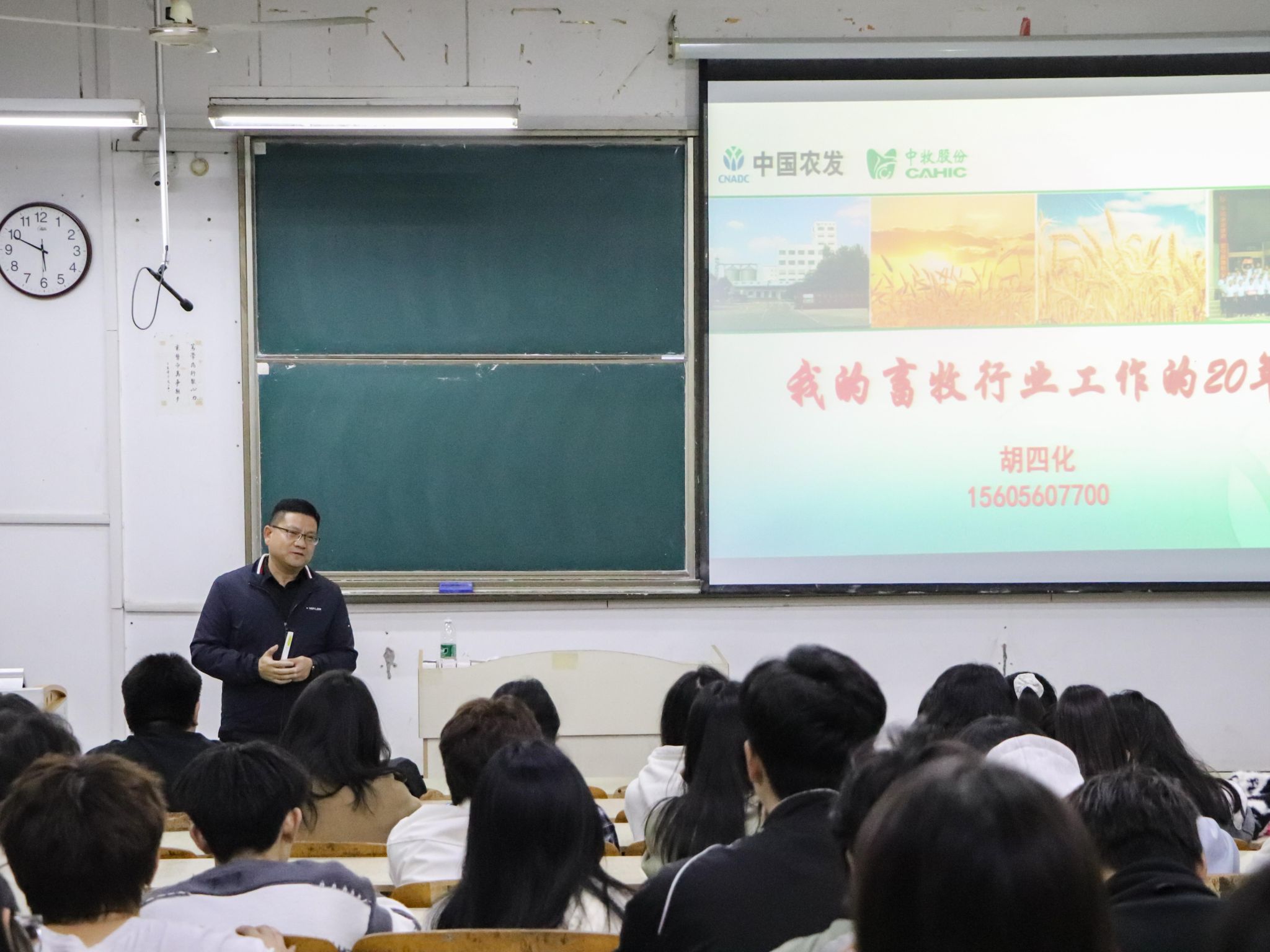 胡四化以“我在畜牧行业工作的二十年”为主题,围绕中牧实业股份有限公司的业务结构升级、自动化改造、养殖理念更新等,通过畜牧业发展过去与现状的对比,以及对行业发展趋势的深入分析,全面阐述了畜牧业近二十年的变革与发展情况。胡四化还结合自身在校期间的社联工作经历以及在畜牧业从业二十年的实践经验,给学弟学妹们提供了极具价值的职业发展建议,希望同学们珍惜大学学习时光,夯实专业学习基础,不断提升实践动手能力,培养吃苦耐劳的意志品质,并衷心祝愿母校发展再创辉煌。