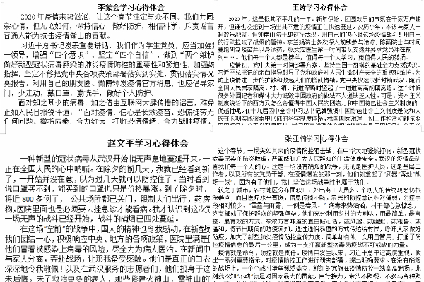 根据校组织部下发《2020年上半年党员学习教育培训安排意见》,支部立即布置本学期党员学习任务,号召学生党员创新学习形式,通过学习强国、人民日报客户端、共产党员网等网络平台进行在线学习。3月份支部安排党员学习了习近平总书记关于疫情防控的讲话精神、党的十九届四中全会、十九届中央纪委第四次全会以及安徽省和学校关于从严治党的文件精神等。学生党员通过观看视频、学习文章推送以及撰写学习心得体会等学习形式,提高思想政治意识,树立党员学习榜样,强化支部战斗堡垒作用。从支部党员撰写的学习心得体会中可以感受到学生党员对本次疫情中中国共产党强大的组织能力和号召能力有了更深刻的认识,更加坚定了“四个自信”,强化了“四个意识”,坚定了紧跟党的步伐的决心。支部党员还积极参加线上互动,为武汉加油,为抗疫助力。