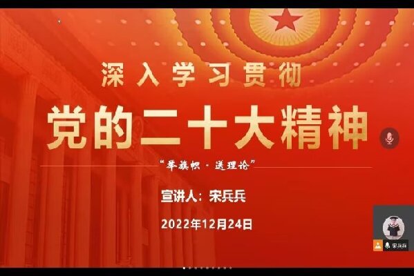 12月24日上午,校辅导员理论宣讲团成员、外国语学院团委副书记宋兵兵利用腾讯会议为该学院学生党员、团学干部和全体入团积极分子开展了以“学习党的二十大 永远跟党走 奋进新征程”为主题的党的二十大精神理论宣讲。
