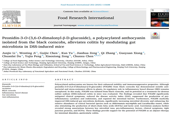 近日,食品科学与工程学院陈春旭副教授以通讯作者身份在国际Top期刊《Food Research International》(Q1,影响因子7.0)发表了题为“Peonidin-3-O-(3,6-O-dimalonyl-β-D-glucoside), a polyacylated anthocyanin isolated from the black corncobs, alleviates colitis by modulating gut microbiota in DSS-induced mice”的高水平研究论文,展现了新年新气象。该论文的第一作者为2022级食品加工与安全专业硕士研究生李俊杰,安徽科技学院为论文第一完成单位,南京农业大学曾晓雄教授课题组为合作单位。