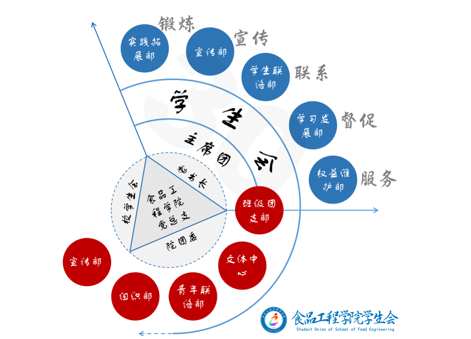为顺应时代发展需要,结合学院事业发展实际,食品工程学院学生会在院党总支的领导下积极完善组织架构,认真听取院团委、校学生会的指导意见。建立“双心双环”体系,构建学生会——团委工作体系,相辅相成,以普通班级为基础组织,设立一名团委老师为学生会秘书长,指导学生会建设。一直以来,学生会坚持以明确职能定位为改革开拓道路,优化组织结构,精简工作流程。面向全体同学,坚持从同学中来,到同学中去,以“全心全意为学生服务”为宗旨。积极落实改革要求,坚持精简原则,优化部门设置,科学瘦身,从严控制学生会人数,建设了一支精干高效、奉献有为的团队。