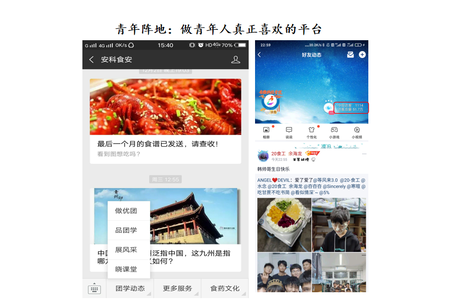 同时,食品工程学院坚持打造青年阵地,围绕青年、服务青年,做青年人真正喜欢的平台。建立“安科食安”微信公众平台,官Q,解读团学政策、传达重点工作、发挥榜样引领。坚持树立学生典型,挖掘先进班集体优秀事迹、发掘学院先进集体、发扬抗疫先进个人事迹,积极邀请优秀大学生、优秀考研学子、省十佳校园记者开展培训、宣讲活动,充分发挥榜样的力量,汇聚朋辈育人坚强动力。建立完备的学生干部培训体系,以院党总支书记“如何做一名优秀学生干部”为首课,以政治学习为根基,辅以新闻稿及文书写作、摄影及ps、办公软件、策划书撰写等培训,培养政治强、能力强、品德优、学习优的双强双优型学生干部。
