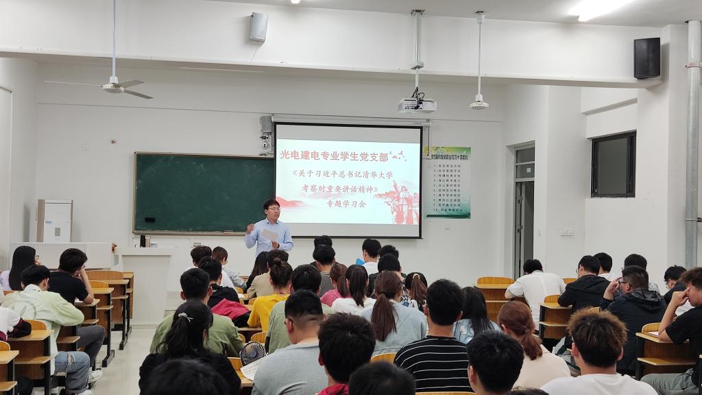 为深入学习贯彻习近平总书记在清华大学考察时的重要讲话精神,切实把习近平总书记关于高等教育的新任务新要求落到实处,着力培养德智体美劳全面发展的社会主义建设者和接班人,5月26日晚上,光电建电专业学生党支部在致知楼B207召开《习近平总书记在清华大学考察时重要讲话精神》专题学习会。党支部书记张深、党支部全体党员参加会议。会议由张深主持。