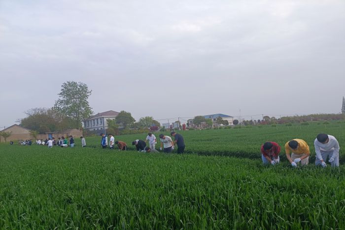 随后,储焰芳带领全体同学开展劳动实践。同学们在储焰芳的细心讲解后进入田间对实践区域进行去杂除劣实践活动。实践劳动结束后,在汤剑等的陪同下何世潮一行参观了皖垦种业明光分公司种子加工中心,参观学习种子烘干、制种及储存流程。