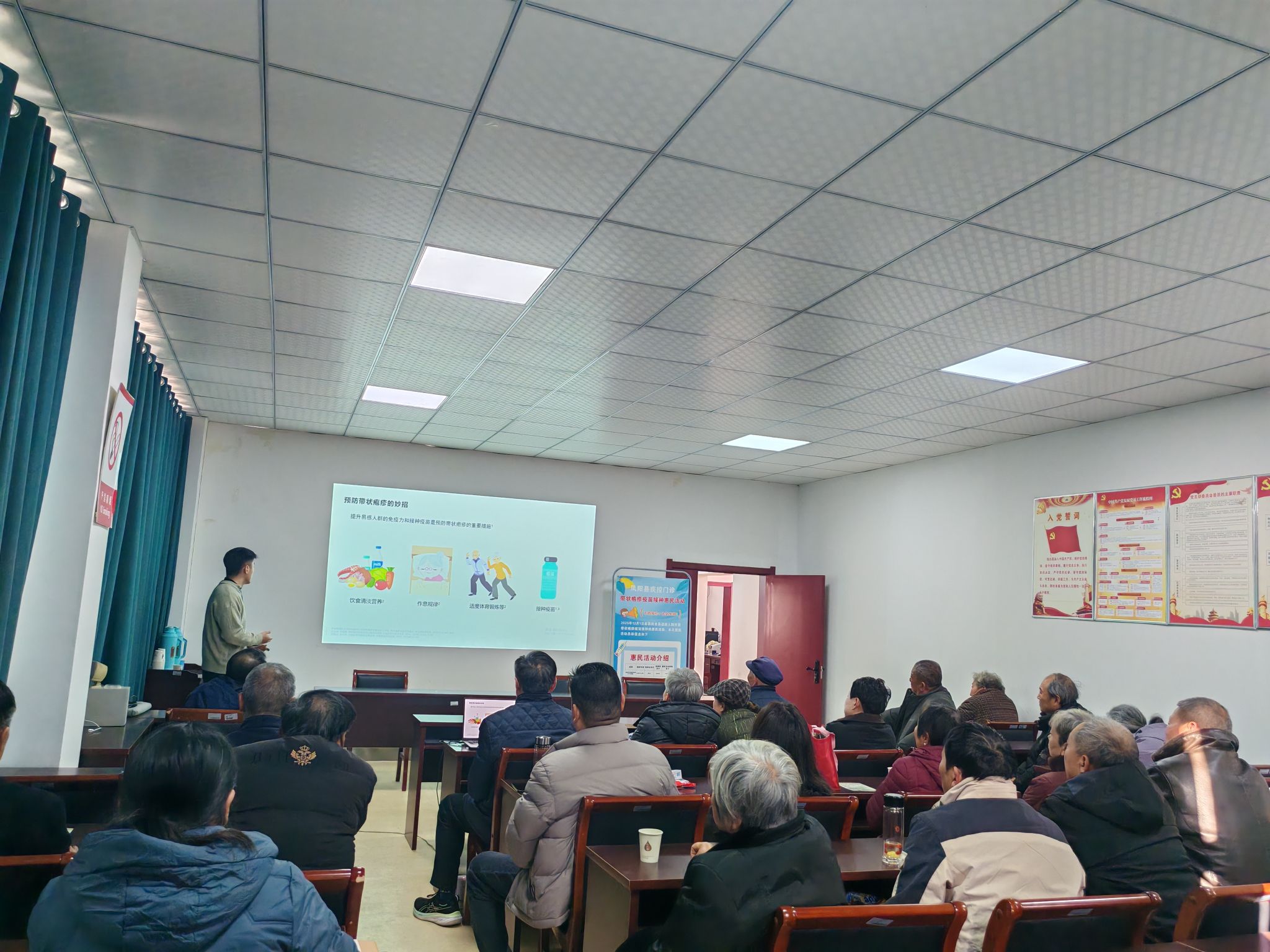 讲座特邀凤阳县疾控中心杨爱洁医生担任主讲嘉宾。杨医生结合老年人免疫力下降的生理特点,用通俗易懂的语言和生动案例,从带状疱疹的发病原因、典型症状、潜在危害等方面展开讲解。他指出,带状疱疹由水痘-带状疱疹病毒引起,常表现为沿神经分布的簇集性水疱,伴有烧灼样、针刺样剧烈疼痛,且可能引发后遗神经痛、眼部并发症等问题,对老年人的生活质量影响极大。针对老同志普遍关心的预防措施,重点介绍了带状疱疹疫苗的接种知识,包括凤阳县疫苗接种点分布、接种对象(50岁及以上人群)、接种程序(肌肉注射2剂,间隔2-6个月)、禁忌人群及接种后的注意事项,强调接种疫苗是目前预防带状疱疹最经济有效的手段。