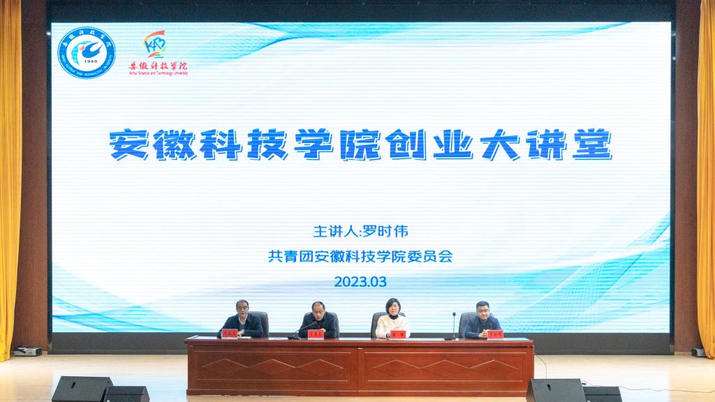 3月22日下午,“安徽科技学院创业大讲堂”2023年首场讲座在龙湖校区举行。本次活动邀请到我校2006届优秀校友、安徽乐承控股有限公司董事长、上海交通大学“新媒体与产业融合”特聘讲师,学校就业“引航导师”罗时伟担任主讲嘉宾,管理学院党委书记丁景良、校团委书记张聪、招生与就业工作处副处长何晓冬出席报告会, KAB创业俱乐部全体成员和管理学院300余名青年学生聆听了讲座。
