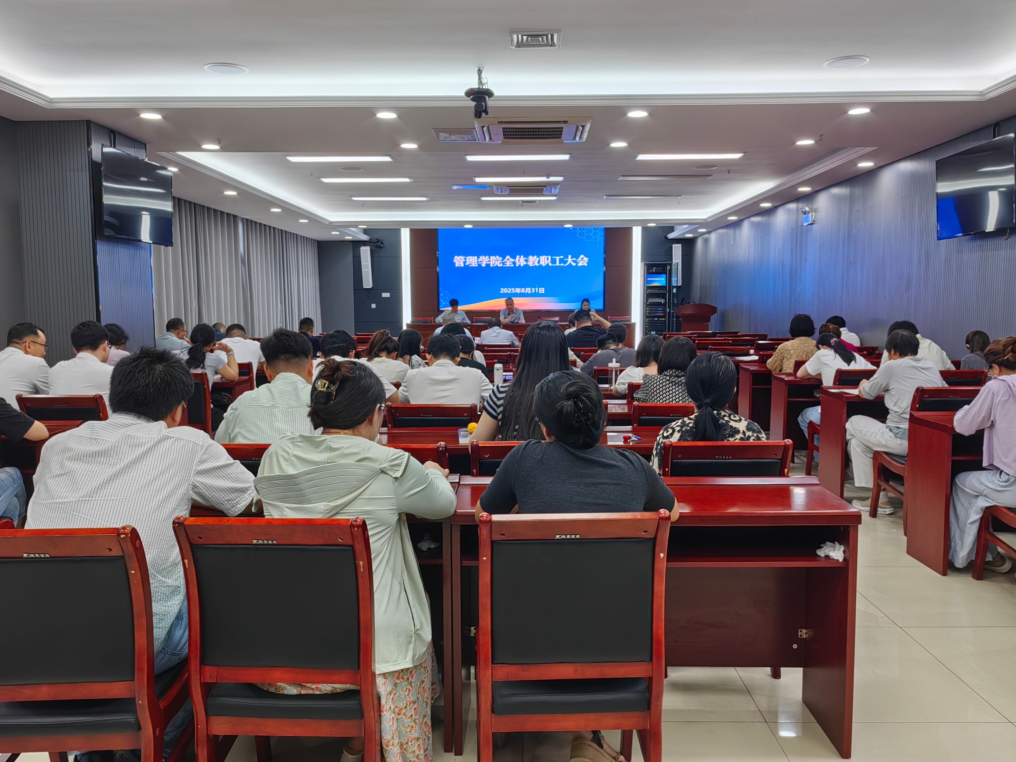 8月31日下午,管理学院在西附楼111会议室召开全体教职工大会,回顾暑期工作,部署安排新学期重点工作。学院党政领导及全体教职工参加会议,会议由学院党委书记丁景良主持。