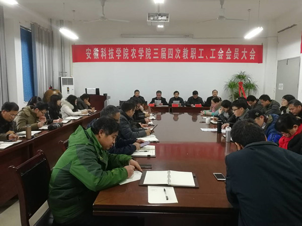 1月3日下午,农学院三届四次教职工暨工会会员大会在学院会议室召开。党总支书记何世潮、院长詹秋文、副书记沈树周、副院长高青海和分工会主席吴孝国在主席台就坐,学院全体教职员工和工会会员参加大会。
