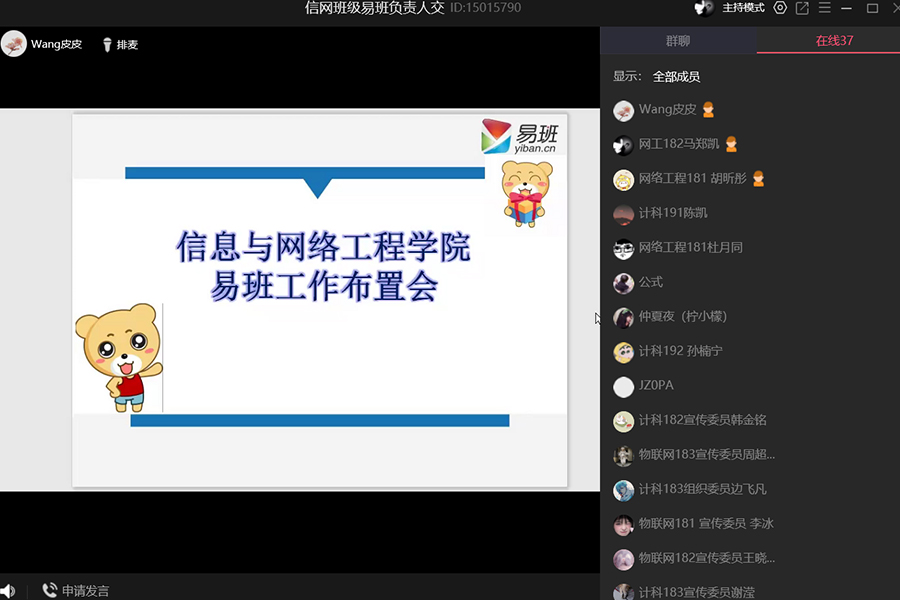 为进一步丰富网络文化内容,充分发掘易班网络育人优势,提升网络思想政治教育成效。5月23日下午,信息与网络工程学院通过线上QQ群课堂召开易班工作布置会。学院2017级、2018级、2019级各班易班负责人及学院易班学生工作站成员参加会议,会议由学院专职辅导员王培培主持。
