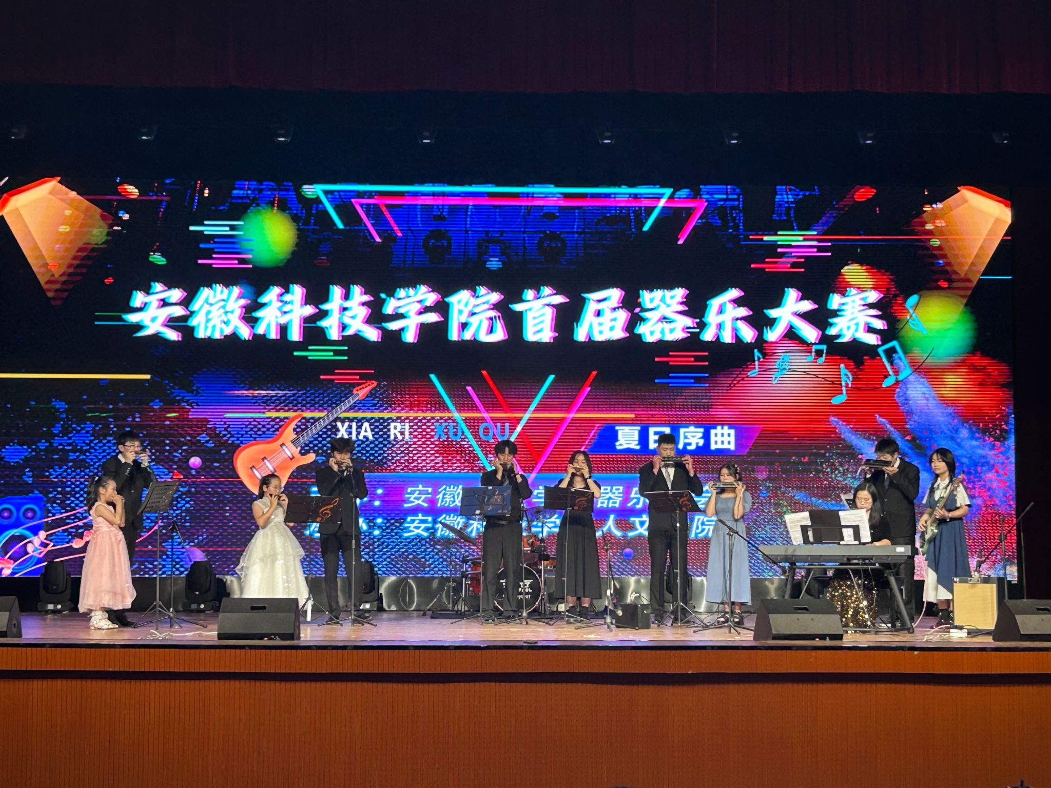 经过初赛的激烈选拔,13组选手脱颖而出会师决赛。在决赛中,评委从音准节奏、舞台表现、难度技巧、舞台风貌4个方面,对选手进行认真细致的评判打分。中国古典乐器葫芦丝、西方特色乐器小提琴、架子鼓等,共同为现场观众带来一场美妙的听觉盛宴。口琴表演曲目《微笑波尔卡》,轻快跳跃的曲调,让人仿佛置身于童年梦境;小提琴独奏《Moon halo》让人们在美的探索中,逐渐厘清月亮的神秘面纱;落点乐队表演的《电动少女》,铿锵有力的贝斯声令现场气氛达到沸点,掌声如潮。器韵悠扬渐,比赛在中都琴韵轻音乐团的器乐大合奏中缓缓落下帷幕。