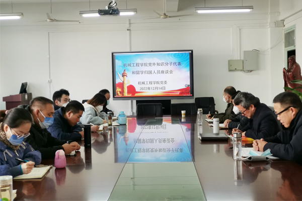 为深入学习宣传贯彻党的二十大精神,结合开展2022年度党外知识分子“双树双建”主题教育,团结凝聚党外知识分子和留学归国人员力量,持续推进学院各项重点工作,2022年12月14日下午,机械工程学院在笃行楼409会议室召开党外知识分子代表和留学归国人员座谈会。会议由学院党委书记胡振江主持,正处级组织员张严政,党委委员、副院长张华、乔印虎,来自九三学社、民进党、中国农工民主党的魏宝丽、张新伟、杨拓宇、查文可,留学归国人员张雅晶、董文彬、余振、石文可、卢亦彤等9位老师参加座谈会。