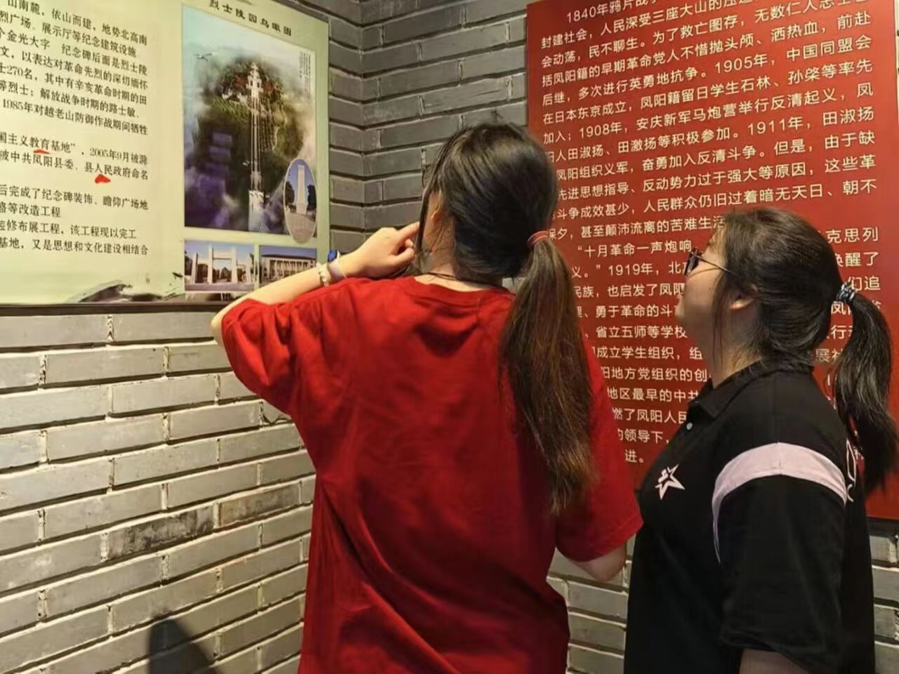 凤阳县烈士陵园始建于1959年,位于府城镇东北部第一山南麓,占地面积约199.8亩,内建有烈士纪念碑、烈士陵墓、英烈广场、展示厅等纪念建筑,团队成员们进入烈士陵园后被陵园中庄严肃穆的气氛所感染。目前长眠在烈士陵墓内的凤阳籍革命烈士85名,无名烈士270名,团队成员们看着一尊尊墓碑,无一不为之动容,正是有这一位位烈士的牺牲,才换来如今的美好生活。烈士陵园的展示厅主要以红色为主基调,团队成员们在展示厅内驻足观望良久,阅读着一个个英雄故事、观摩着一件件战争时期的老物件,英雄的形象仿佛鲜活起来。最后,团队成员们怀着敬仰之情站在革命雕塑前,向革命先烈行三鞠躬礼,默哀三分钟,共同凭吊烈士英灵,向长眠在此的烈士表达深深的哀思和无尽的怀念。