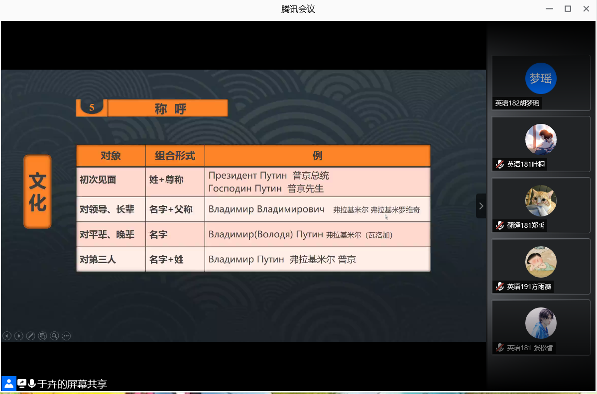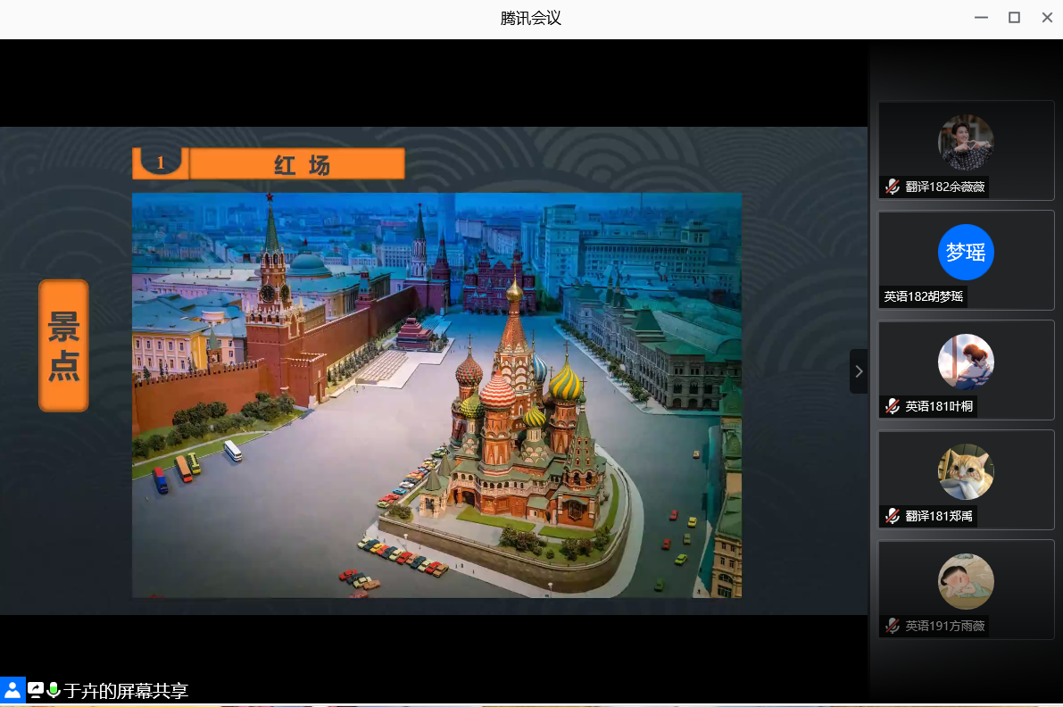 为进一步丰富外国语学院学生校园文化生活,拓宽学生对俄罗斯文化的了解和认识,领略俄罗斯的风情,外国语学院于6月17日晚上,利用腾讯会议,举行“英博杯”安徽科技学院第十一届外语文化节之俄罗斯风情讲座。本次讲座邀请校教务处于卉老师担任主讲人,外国语学院18、19级全体学生参加,外国语学院专职辅导员宋兵兵老师主持本次讲座。