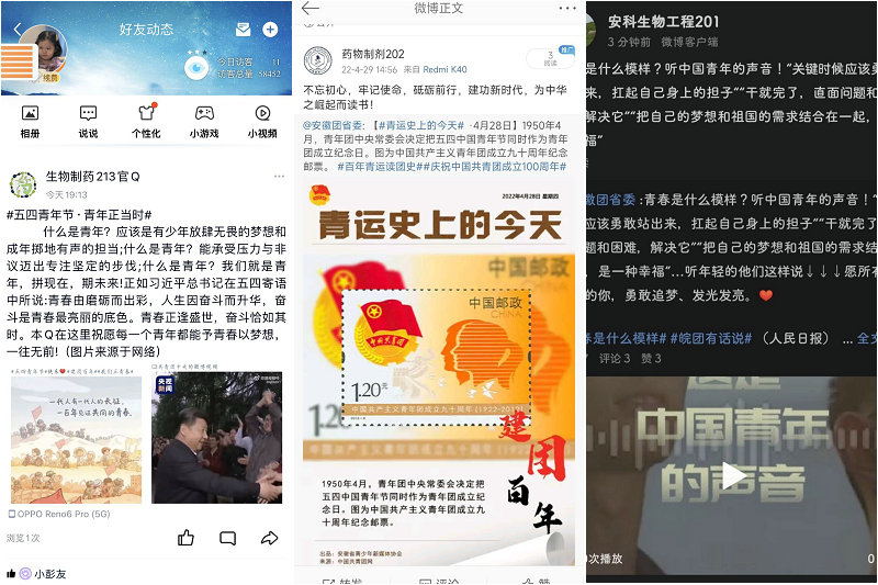 引领青年思想,坚定青年信仰。针对社会发展出现的新媒体领域,学院根据青年学生成长的特点,创新思想引领工作载体,增强共青团工作效率。学院积极动员各级团组织关注学习“安徽团省委”微博推出的“青运史上的今天”“团务知识百问百答”“我与团旗合影”话题,参与话题联动,并完成“永远跟党走,建功新时代”网络接力视频拍摄活动,展现青年人应有的赤忱和纯粹,迸发属于青年一代的力量!